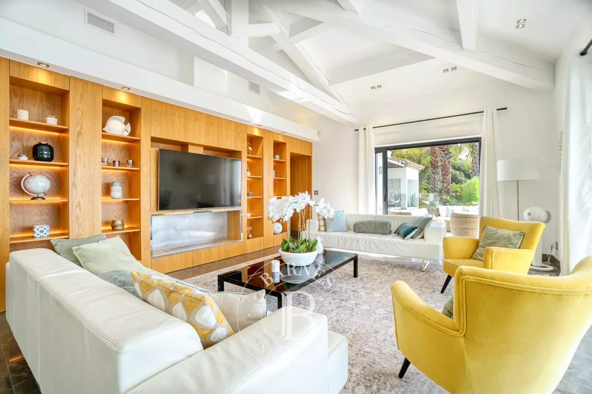 * Villa Blanche * Located in a secure and quiet domain, this modern villa of 240 sqm (2583 sq. ft.) benefits from a view on the sea and on the golf of Sainte-Maxime. On the first floor, a fully equipped kitchen, a bright living room with a large living room opening onto large terraces, a bedroom en suite with its bathroom, its dressing room and its access to the terrace. On the garden level, a fitness room as well as three bedrooms en suite each with its own shower room, dressing room and office space. Outside, a secured swimming pool, a shower and a nicely planted garden which benefits from several terraces, one sunny, one shaded as well as one on the roof. Equipment : Alarm and video surveillance system, air conditioning, plancha, parking for several cars, electric gate Services included: House cleaning at the entrance, cleaning during the stay (1 day/2-3 days), linen and personalized BARNES concierge service. n°83115004858SB